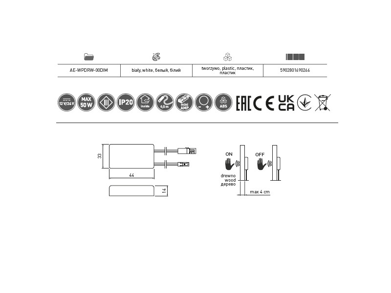 0.00 грнБесконтактный выключатель под столешницу ON-OFF,12V 50W, белый AE-WPDRW-00 GTV