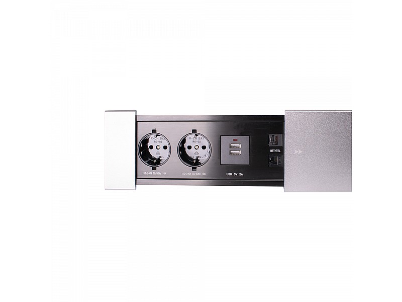 0.00 грнБлок врезной на 2 розетки 2USB телефонный сетевой разъем с выдвижной крышкой (алюминий)