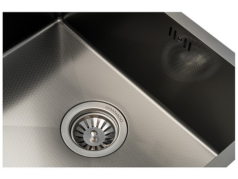 GRANADO Under top max STEEL S201 black honeycomb – стальная кухонная мойка с монтажом под столешницу. Вы будете благодарны себе за то, что выбрали именно её! Благодаря креплению под столешницей эта модель очень легка в уходе: на поверхности нет стыков, где могла бы собираться грязь. Сталь устойчива к воздействию воды и моющих средств, легко выдерживает высокие температуры. С декоративным покрытием, напоминающим пчелиные соты, материал становится еще более выносливым, так как на нем не остаются царапины. Черный цвет, нанесенный методом вакуумного напыления PVD, придает GRANADO Under top max STEEL S201 black honeycomb особую роскошь. В то же время такая обработка дополнительно улучшает характеристики стали. Поверхность этой модели поглощает шум, оставляя вам только преимущества стальной кухонной мойки. Большая чаша GRANADO Under top max STEEL S201 black honeycomb вместит много посуды или продуктов, при этом не занимая значительную площадь вашей рабочей поверхности