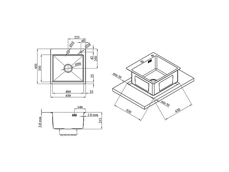 0.00 грнМойка нержавеющая KRONER KRP HM 4545 3,0/1,0 мм с корзиной