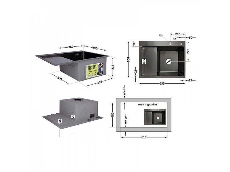 0.00 грнМойка нержавеющая LIDZ H6350BL PVD Black Brush 3,0/1,0 мм (45589) с дозатором крыло слева черный