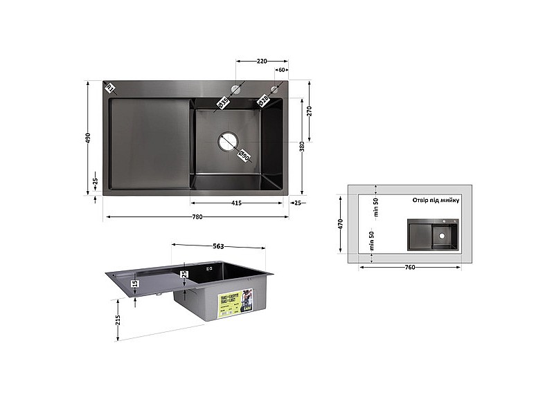 - Комплектация изделия: Мойка, сифон, слив/перелив, корзинчатый вентиль, дозатор, крепеж.