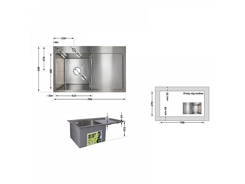 Комплектация изделия: Мойка, сифон, слив/перелив, корзинчатый вентиль, дозатор, крепеж.
