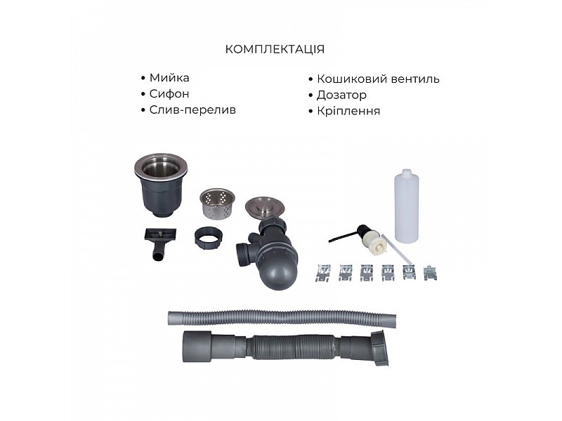 Комплектація виробу: Мийка, сифон, слив/перелив, кошиковий вентиль, дозатор, кріплення,кошик.