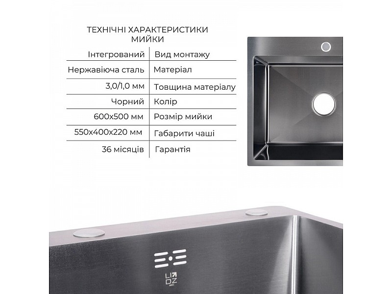 0.00 грнМийка нержавіюча LIDZ H6050B PVD Black Brush 3,0/1,0 мм з дозатором та кошиком чорний