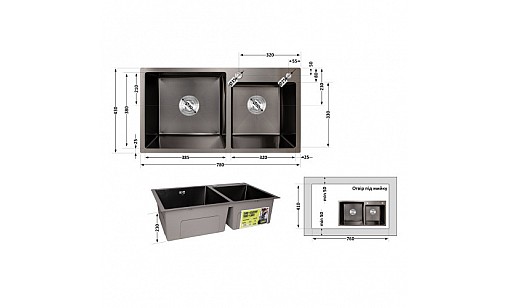 - Комплектація виробу: Мийка, сифон, злив/перелив, корзинчастий вентиль, дозатор, кріплення.