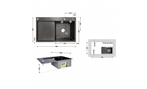 - Комплектація виробу: Мийка, сифон, злив/перелив, корзинчастий вентиль, дозатор, кріплення.