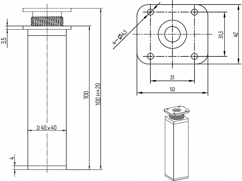 Нiжка регульована квадратна 40*40мм h-100мм Біла ДС