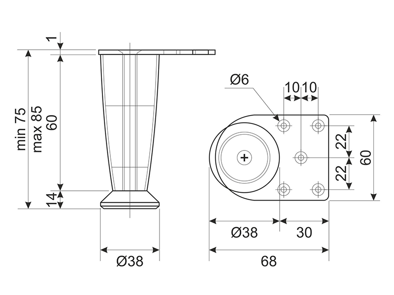 0.00 грнНіжка меблева стальна DZ 056/75 G2 Хром Н=75ммконусна ДС