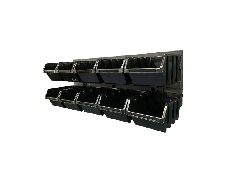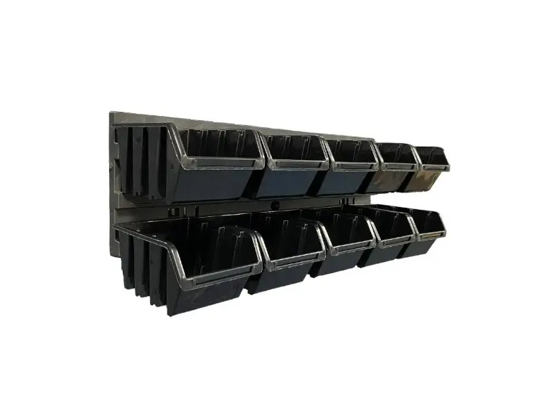 Набор предназначен для обустройства помещения мастерской, гаража и другого рабочего пространства. С ним удобно хранить инструменты и крепления. Набор легко и быстро складывается. В комплект входят: Подвесная доска для емкостей KBBS4013: Размеры - 386x18x130 мм. Количество - 1 шт. Имеет отверстия для крепежных штифтов, что позволяет легко и надежно повесить набор на стене. Предназначена для подвешивания емкостей, крючков и полок для инструментов. Емкость для хранения TRUCK, KTR12-S411: Размеры - 115х80х60 мм. Количество - 10 шт. Цвет - черный. Все элементы набора изготовлены из прочной полимерной смеси.