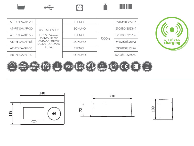 Удлинитель для офиса AVARO PLUS, 1 розетка SCHUKO USB А С WC 5W провод 1,5 м алюминий AE-PB1SAVAP-53 GTV